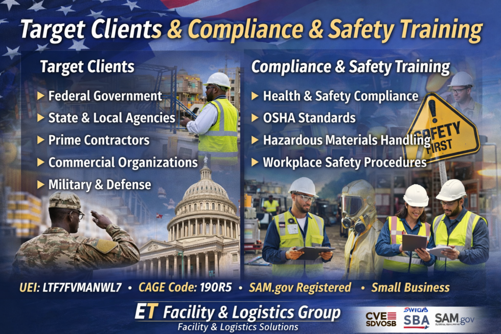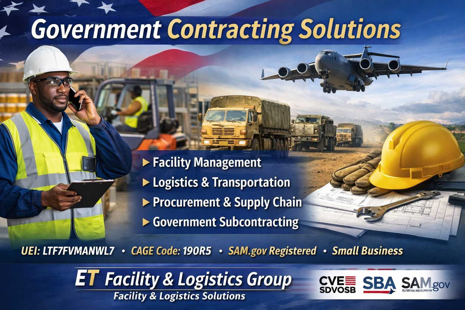 ET Facility & Logistics Group provides facility services, logistics coordination, procurement support, and operational services for government agencies, commercial organizations, and prime contractors.